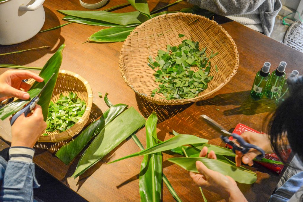 アトリエの庭から月桃を収穫し、千切りにし、蒸留し、ハーブウォーター(芳香蒸留水)を作るコースです。できあがりの蒸留水(約100-200ml)は、人数分にお分けしてお渡しします。